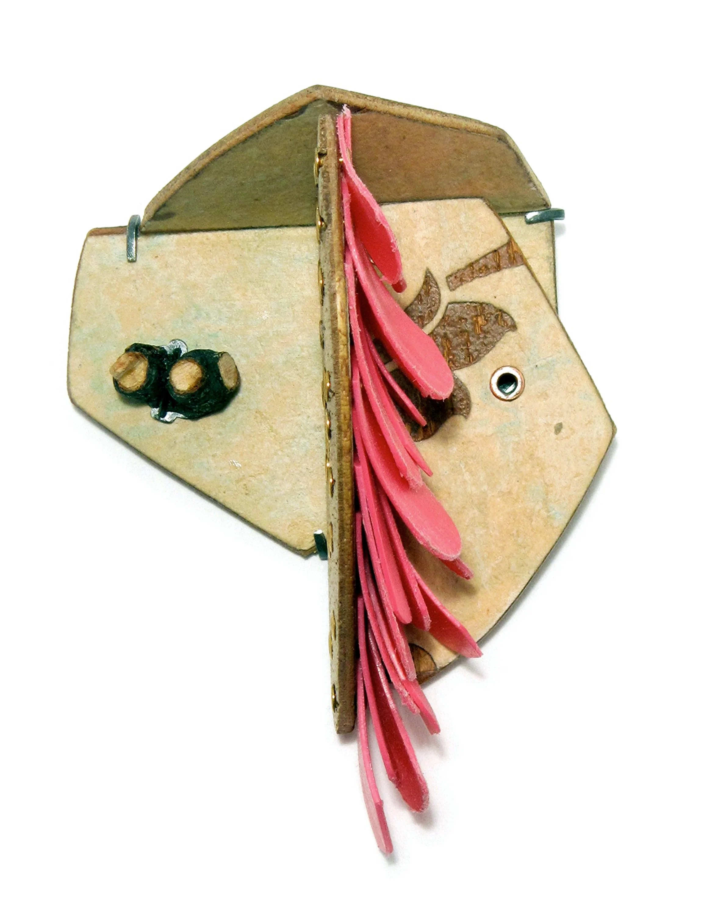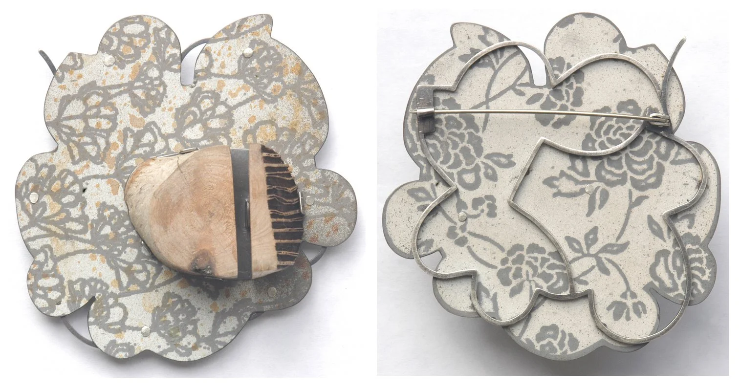 Etched, wallpapered wood paneling, twig, plastic, sterling silver. 4.5" x 3" x .5"
