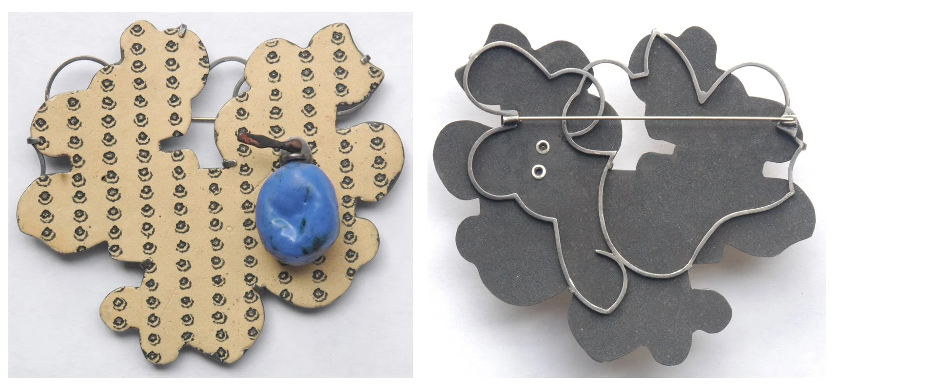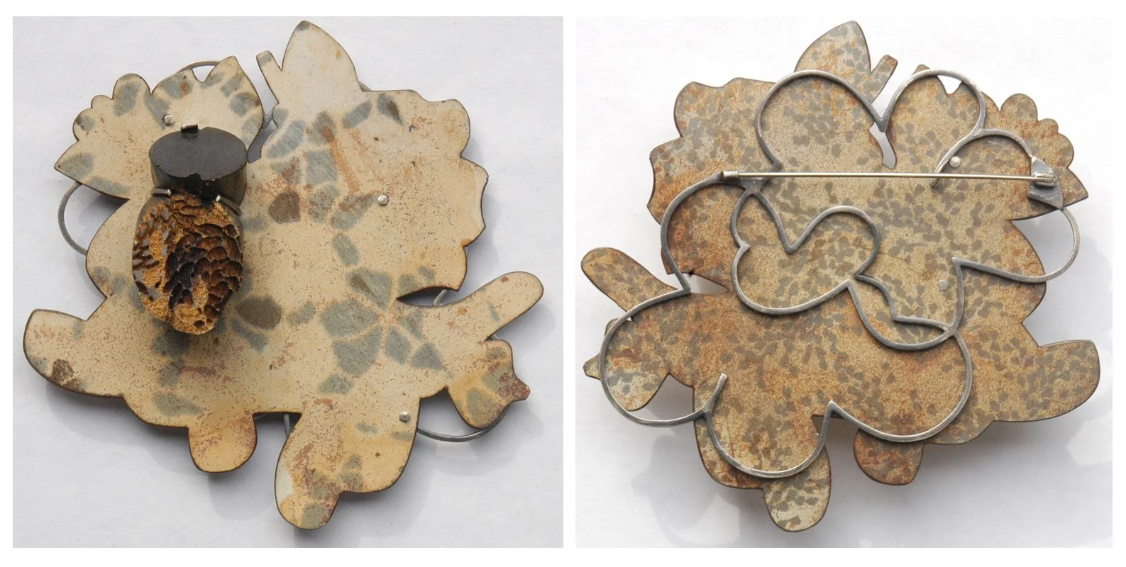 Steel, etched enamel, electroformed-enamel copper, sterling silver.