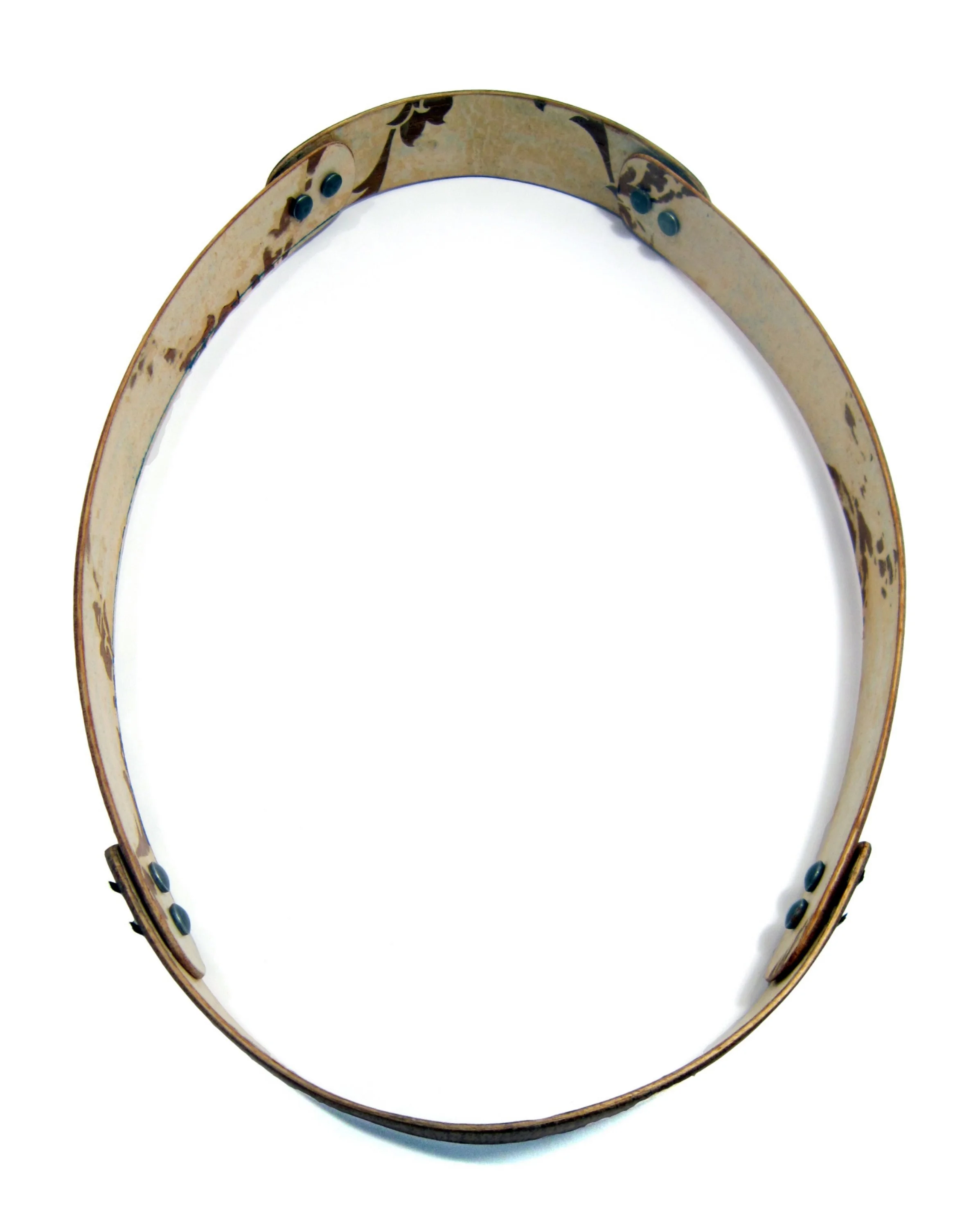 Etched, wallpapered wood paneling, thread, beads, sterling silver. 6" x 3" x .25"